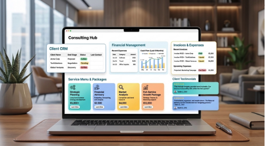 The Consulting Hub: The business hub. It covers key areas, including a Client CRM, Service Package Menu, and an Invoices Tracker that links directly to your service rates.