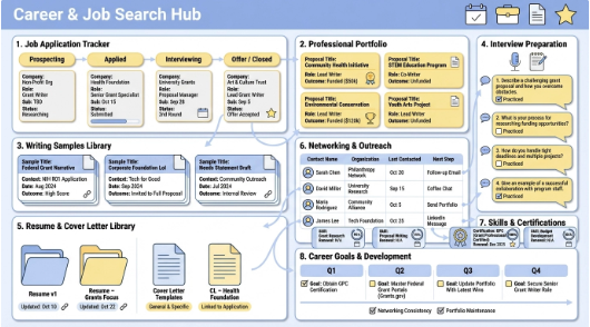 Landing a high-level grant writing role requires more than a strong resume. It also requires a system for organizing your search and your application materials. The Career & Job Search Hub is a comprehensive workspace designed to help you manage your career growth, track your application pipeline, and prepare for interviews.