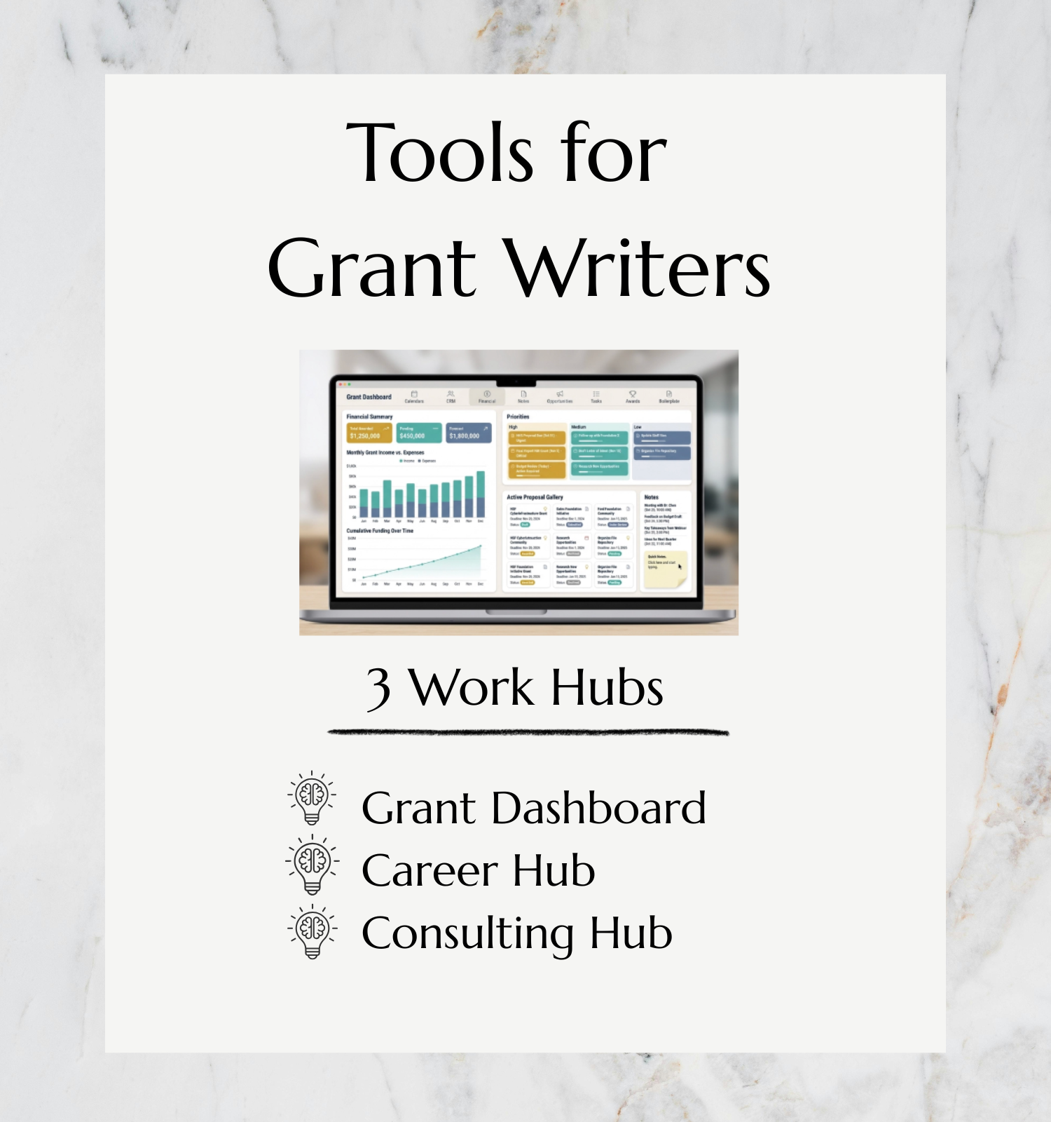 Why settle for a single tool when you can have the full ecosystem? The suite of all three work hubs provides a complete productivity system. It combines the Grant Dashboard for the grant lifecycle with the business-management power of the Consulting Hub and the strategic growth of the Career Hub.