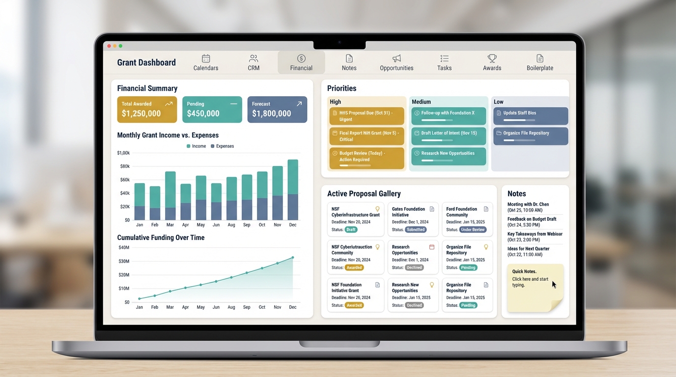 Includes quick access to a boilerplate library, grant award tracker, CRM, and daily note log, keeping all your research and drafting in one focused environment.